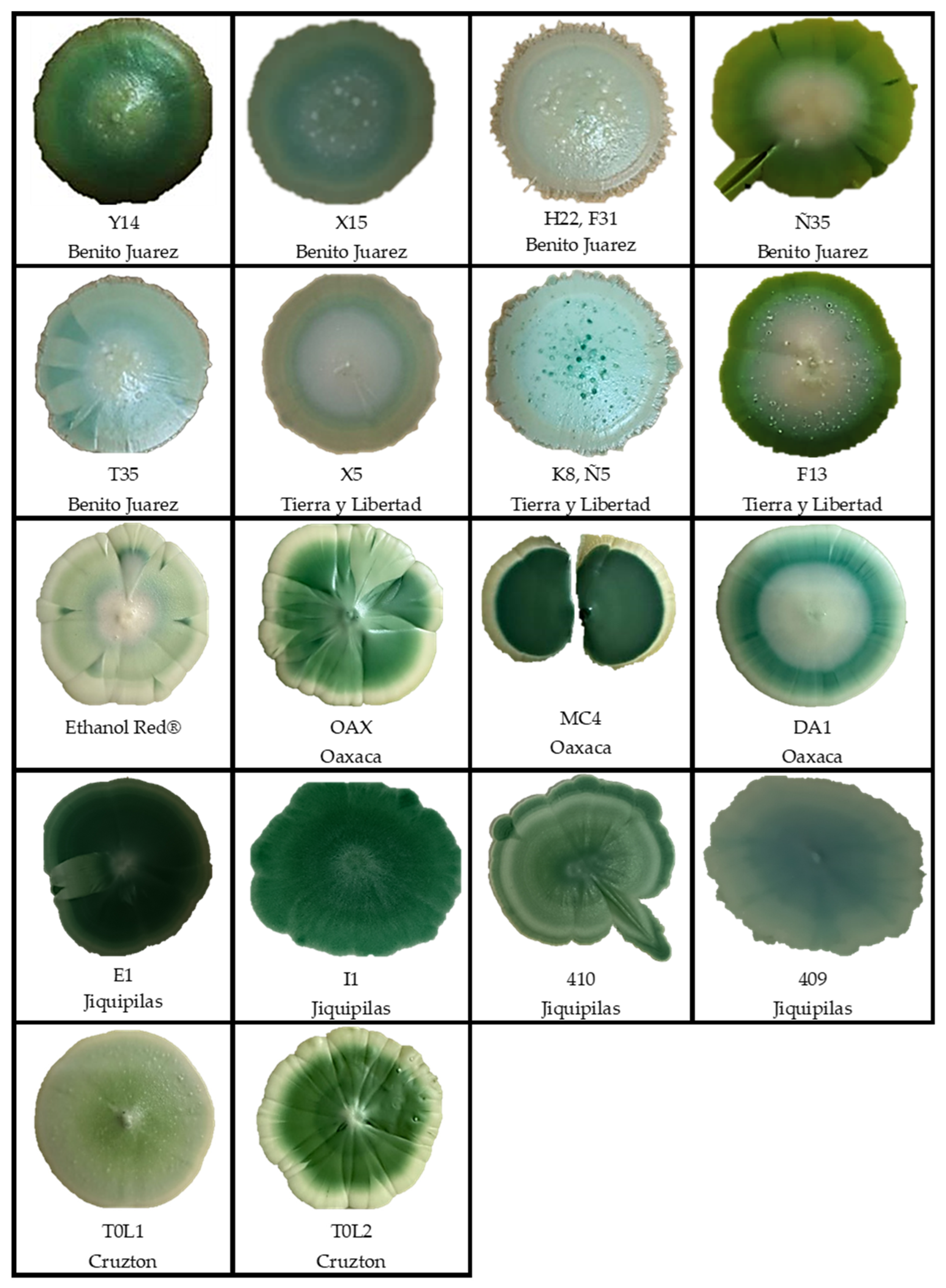 | F13, X5, K8, Ñ5 | Taberna | Tierra y Libertad, Jiquipilas, Chiapas | −80 °C/Glycerol 1:1 | Biotecnology Lab./ UNICACH |
