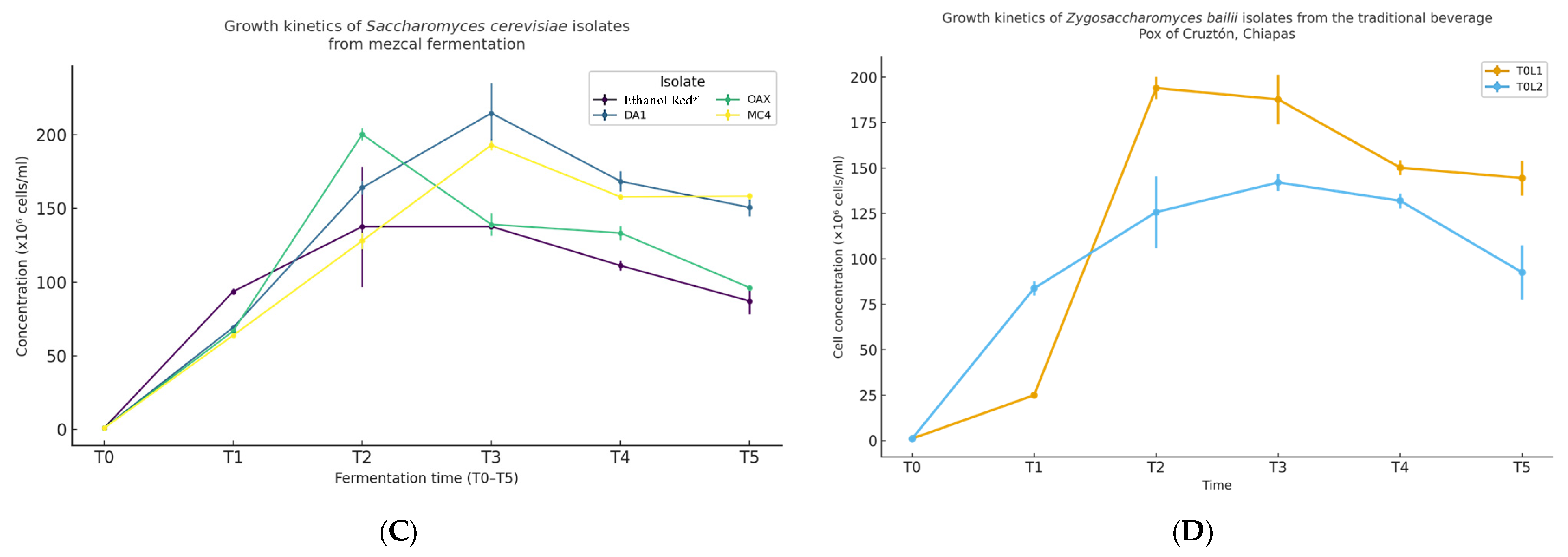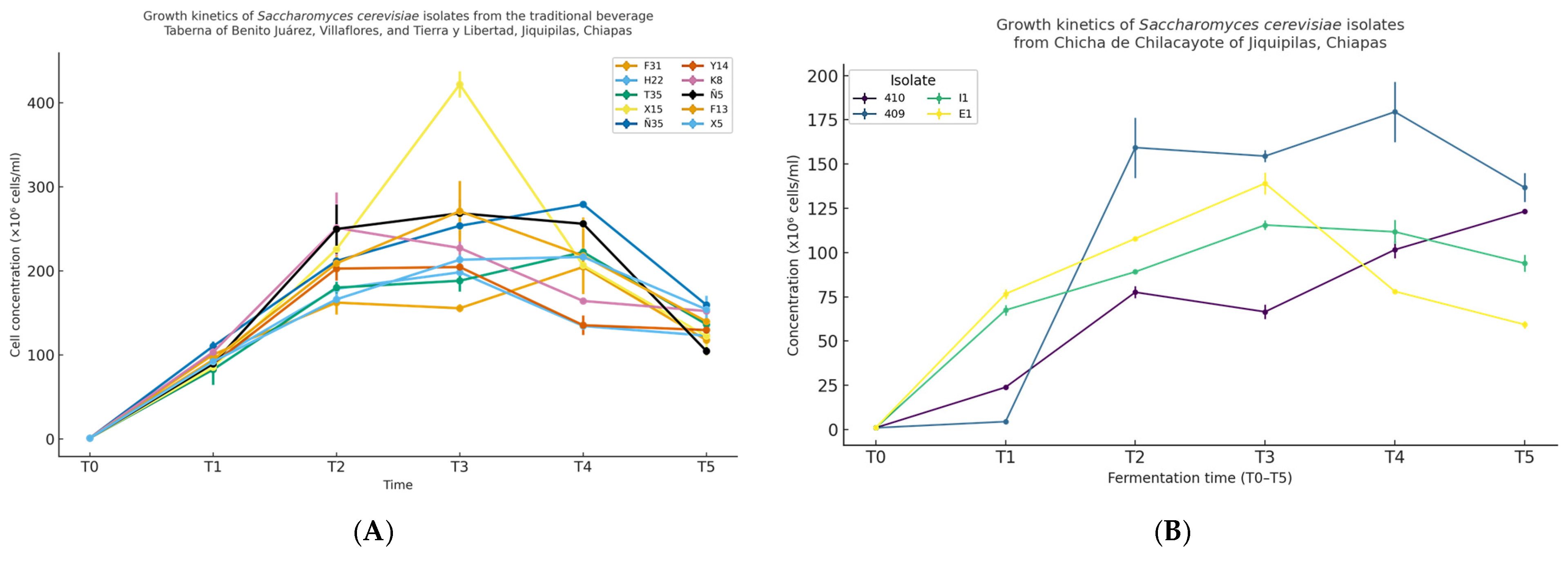 | E1, 410, I1, 409 | Chicha de chilacayote | Jiquipilas, Chiapas | −80 °C/Glycerol 1:1 | Biotecnology Lab./ UNICACH |
