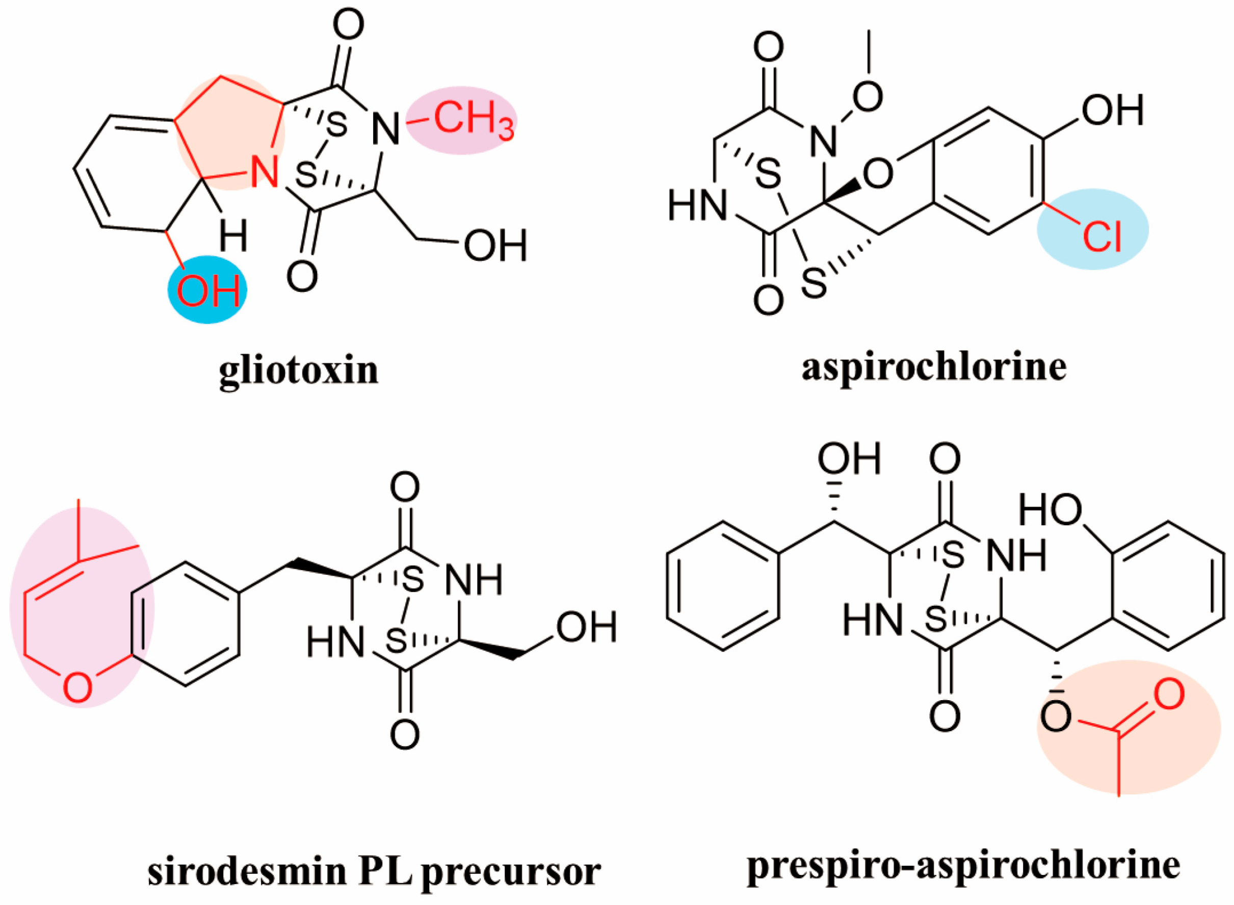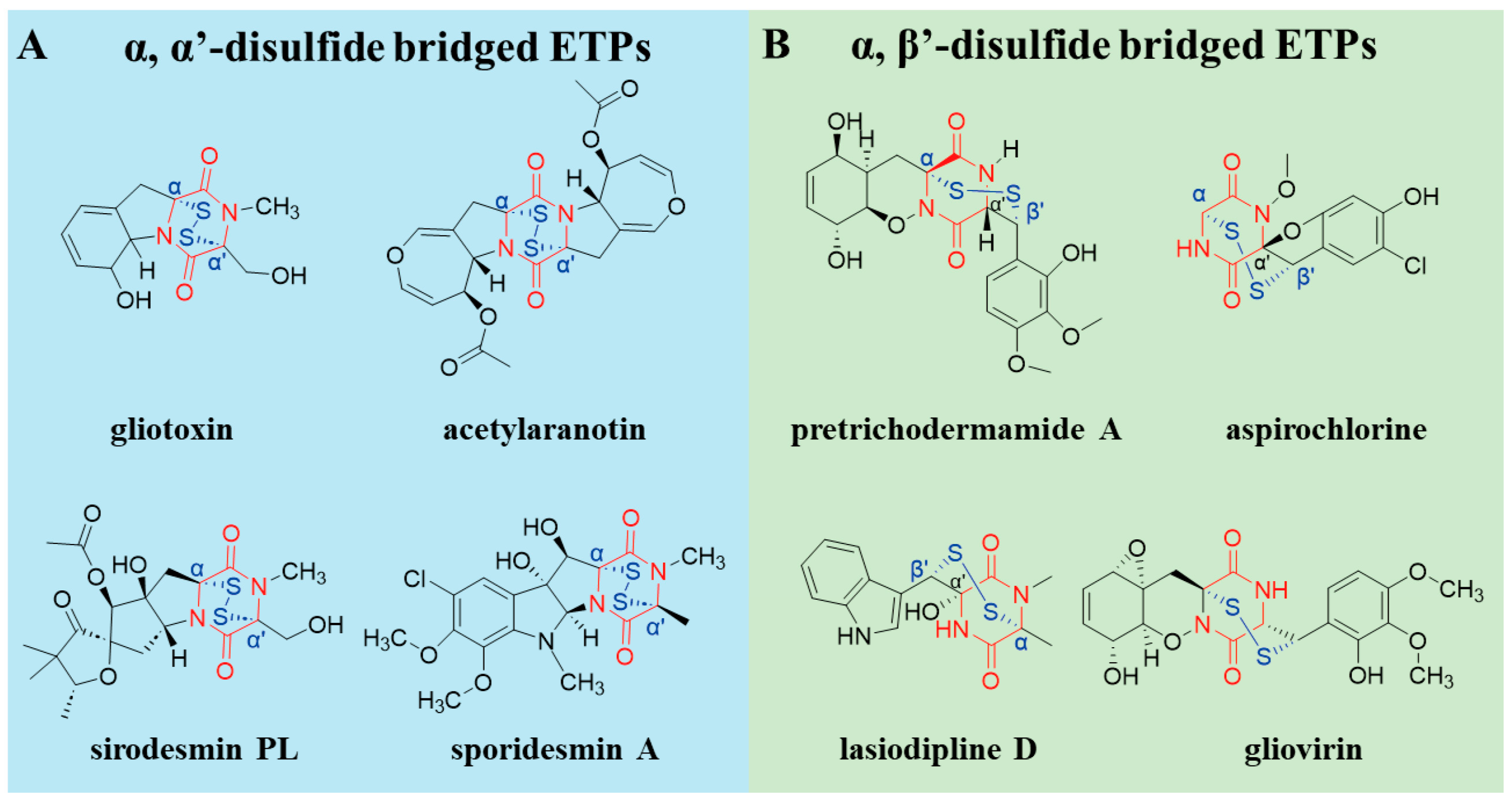 - Huber, E.M. Epipolythiodioxopiperazine-Based natural products: Building blocks, biosynthesis and biological activities. ChemBioChem 2022, 23, e202200341. [Google Scholar] [CrossRef]