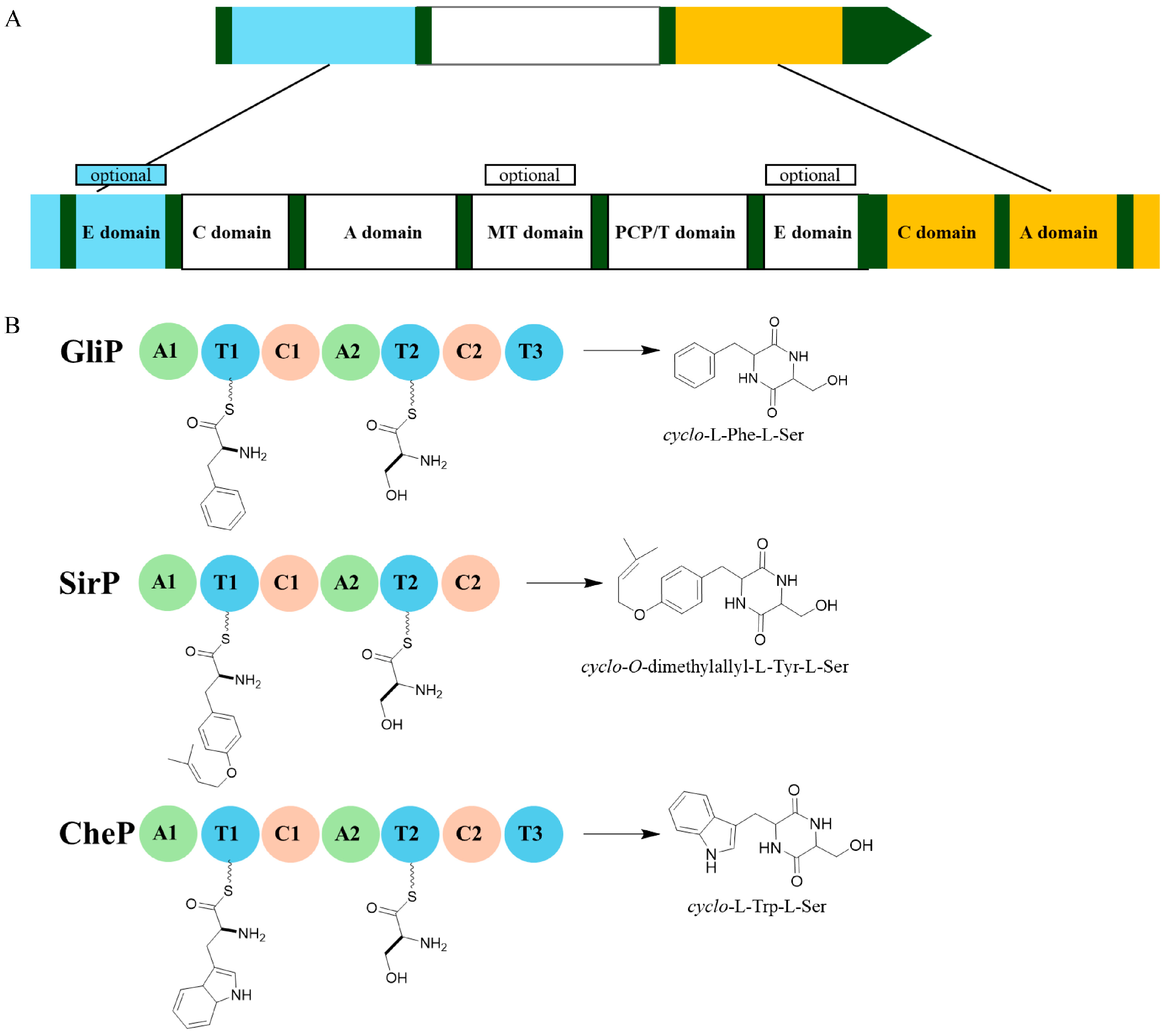 - Chen, X.; Zhang, H.; Zou, Y. Biosynthesis and metabolic engineering of fungal non-ribosomal peptides. Synth. Biol. J. 2024, 5, 571. [Google Scholar] [CrossRef]