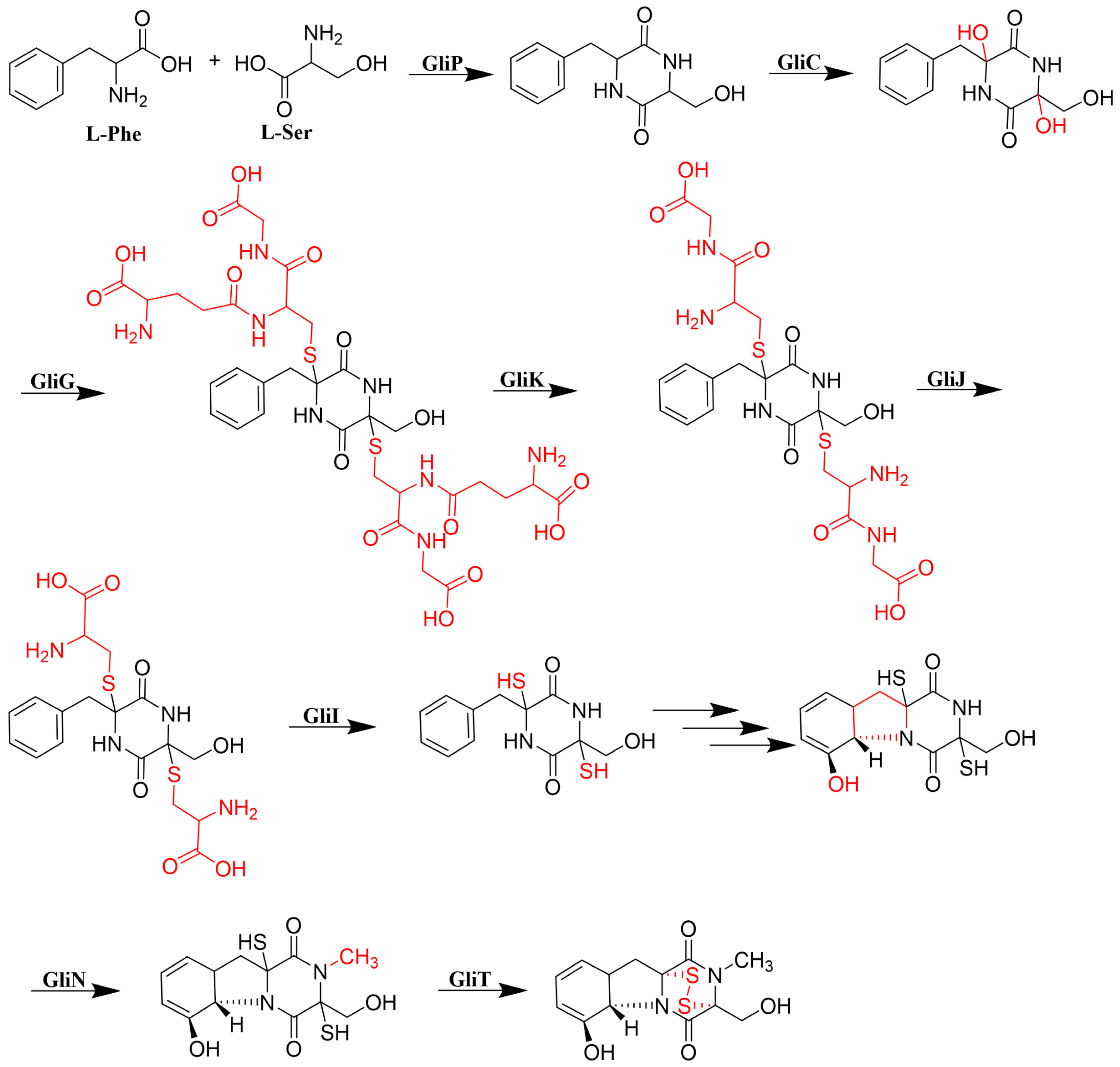 - Ye, W.; Liu, T.; Zhang, W.; Zhang, W. The toxic mechanism of gliotoxins and biosynthetic strategies for toxicity prevention. Int. J. Mol. Sci. 2021, 22, 13510. [Google Scholar] [CrossRef]