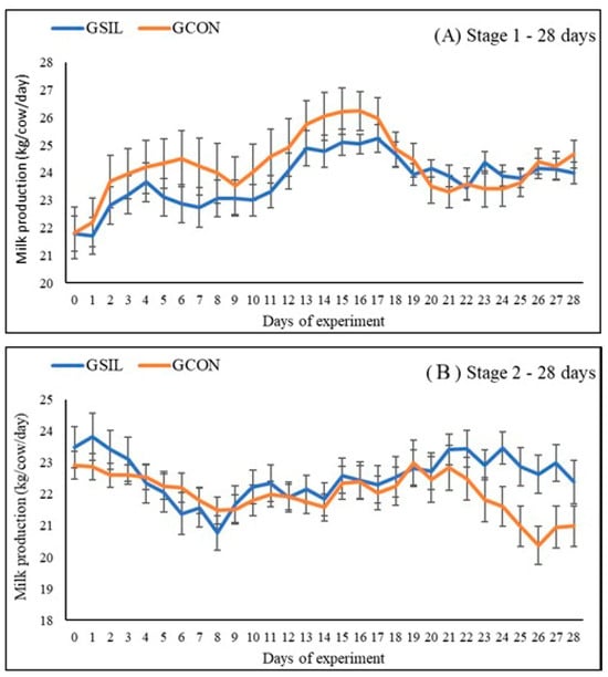 Daily milk production of dairy cows receiving a control diet (GCON) or a diet with silymarin (GSIL) during a crossover experiment ((A)—Stage 1; (B)—Stage 2). Data are presented as mean ± SEM.