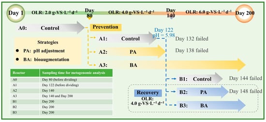 The 200-day experiment induced system acidification by progressively increasing the OLR, comparing the ability of bioaugmentation (BA) and pH adjustment (PA) to maintain and recover methanogenic performance in anaerobic systems, as outlined in Figure 1.
