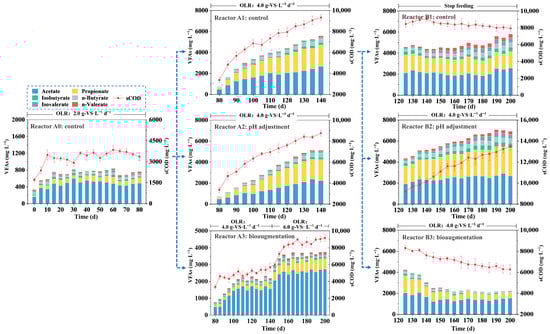 TAN increased gradually during operation, with no marked differences under identical conditions (Figure S1). In B1, TAN initially rose due to hydrolysis of residual substrate, then declined, possibly due to microbial assimilation [38]. FAN levels are influenced by TAN, pH, and temperature [19]. The sharp FAN decreases in A1 (day 84) and A3 (days 84 and 144) coincided with pH drops following OLR increases. Reactors A2 and B2, receiving pH adjustment, showed the highest FAN levels. Since FAN inhibition has been reported between 53 and 1450 mg·L−1 [39], pH adjustment strategies require careful monitoring to avoid ammonia toxicity. In summary, bioaugmentation effectively prevented and alleviated VFA accumulation under high OLR, while enhancing VFA utilization and metabolism.