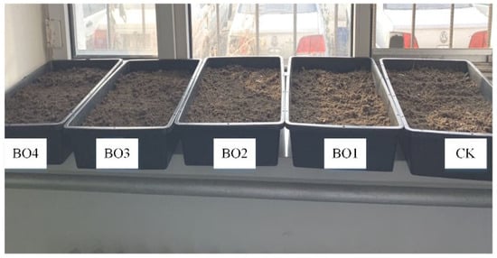 The biogas residue was taken from Lindian Siho Township Biogas Engineering Centre of Harbin Bonang Environmental Protection Science and Technology Co. (Harbin, China). Biochar was prepared from corn cobs at Northeast Agricultural University (Harbin, China). Corn cobs were collected from the experimental base of Xiangyang Farm of Northeast Agricultural University (Harbin, China), and the collected corn cobs were crushed through an 80-mesh sieve, washed with deionized water and anhydrous ethanol to remove the impurities, and put into an oven at 105 °C to dry until constant weight. The dried corn cobs were put into a tube furnace with N2 for heating and carbonation, with a heating rate of 10 °C/min and a carbonation temperature of 600 °C, and kept for 1 h to produce corn cob biochar. It was cleaned with ultrapure water, dried, and put into a drying dish for subsequent use. The specific surface area of the biochar was measured by the nitrogen adsorption method (BET) to be 120.24 m2/g, and the particle size ranged from 0.1 to 0.5 mm. The soil was collected from the 0–20 cm layer of Haoer Village, Wuxin Township, Dulbert Mongolian Autonomous County, Daqing City, Heilongjiang Province (45°55′38″ N, 126°55′34″ E). The soil water content was 20.06%. Five 1 m × 1 m sample squares were set up evenly in the maize field at the soil extraction site, the 0–20 cm surface soil was collected from each sample square after clearing the surface crop residues, the soil from the five sample squares was mixed thoroughly, and, then, some of the soil was taken back to the house in bags. Fresh soil, after removing debris such as crop leaves, roots, and stones, was sieved through a soil sieve with a pore size of 10 mesh and set aside. The air-dried soil samples and biochar-based organic fertilizer were ground through a 10-mesh sieve and set aside. The relatively brief growth cycle of cabbage, from seed to maturity, allows for the completion of this process in a few weeks. Cabbage is adaptable to the growth environment and suitable for control under laboratory conditions, facilitating researchers’ ability to accurately control temperature, moisture, light, and other variables to ensure the accuracy of the experiment. As a common vegetable, cabbage offers a relatively rich research material, providing theoretical support and an experimental basis for the experiment. Due to the aforementioned characteristics of cabbage, we selected it as the experimental subject. In the pot experiment, choose 50 cm long, 25 cm wide, and 20 cm high nursery pots for planting cabbage experiments in kind, as shown in Figure 1.