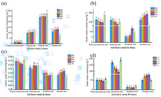 (a) Effects of biochar-based organic fertilizer on heavy metal Cu speciation in soil. (b) Effects of biochar-based organic fertilizer on heavy metal Zn speciation in soil. (c) Effects of biochar-based organic fertilizer on heavy metal Cd speciation in soil. (d) Effects of biochar-based organic fertilizer on heavy metal Pb speciation in soil. The different letters denote significant differences (p > 0.05), while the same letters show no significant difference (p < 0.05) The data represent the mean ± standard deviation of three replicates.