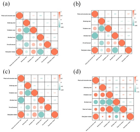 (a) Correlation analysis of Cu speciation in soil and Cu content in plant. (b) Correlation analysis of Cu speciation in soil and Zn content in plant. (c) Correlation analysis of Cu speciation in soil and Zn content in plant. (d) Correlation analysis of Pb speciation in soil and Pb content in plant.