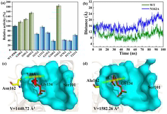 Among the 11 mutants, four variants (G100A, S101A, Q103A, and N162A) showed increased specific activity compared to WT, with the N162A mutant exhibiting a significant improvement (425.62 U/mg), which was 1.84 times higher than the WT (231.32 U/mg) (Figure 2a). We hypothesized that the enhanced activity of the N162A mutant was due to a reduction in steric hindrance within the substrate-binding pocket, allowing better access to the keratin substrate. Structural analysis of the N162A mutation revealed that the distance between site 162 and Ser101, which was located at the opposite end of the pocket, increased from 9.95 angstroms to 16.1 angstroms after mutation (Figure 2b). This structural change led to the opening of the substrate entrance, particularly between Ala162 and Gly134, where the distance increased from 7.88 Å to 10.71 Å (Figure 2c,d). This larger gap facilitated easier substrate entry, thus improving the enzyme’s catalytic efficiency.