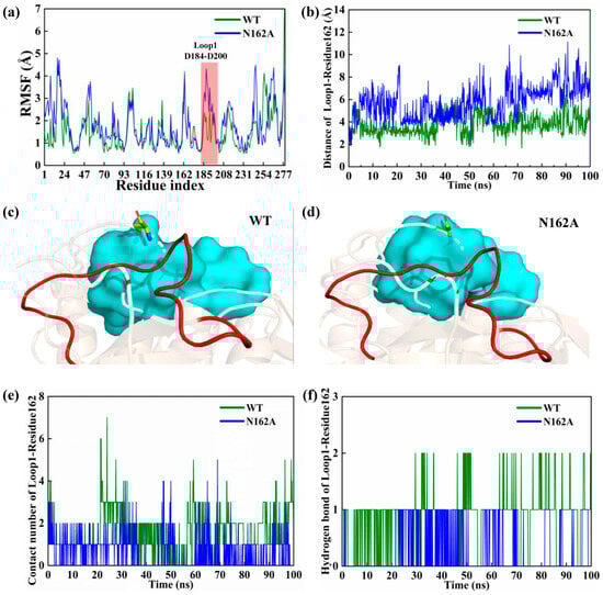 The effects of N162A mutation on the local structure of WT. (a) RMSF values; (b) the distance between Loop 1 and Site 162; (c,d) relative positions of Loop1 and Site 162 in WT and N162A structures; the number of contacts (e) and hydrogen bonds (f) between Loop 1 and Site 162. Loop 1 is highlighted in red, and the substrate pocket is illustrated using blue foam with the replaced residue 162 highlighted by a yellow stick.