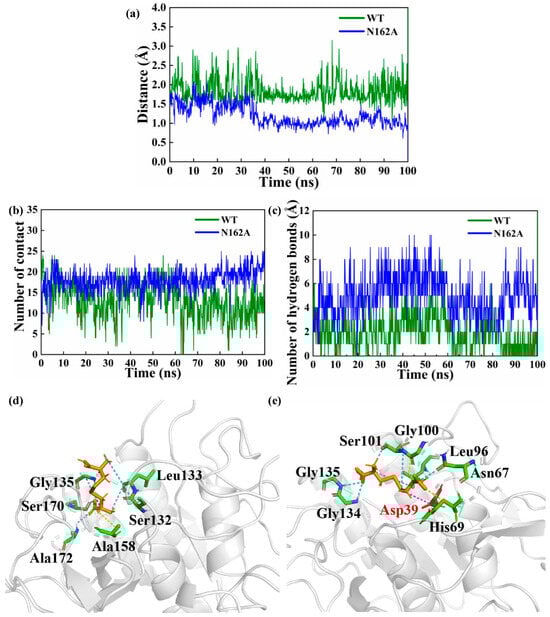 Analysis of the source of improved kcat value of N162A by MD simulation. (a) The distance between the WT or N162A and the L-cystine; the number of contacts (b) and hydrogen bonds (c) between WT or N162A and L-cystine. (d,e) Interactions formed in the complexes of WT and mutant N162A with L-cystine. Substrate L-cystine is shown with an orange stick, hydrogen-bonding interactions are displayed as green dotted lines, hydrophobic interaction is exhibited by gray dotted lines, and salt bridge distance is labeled with red dotted lines.