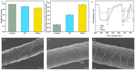 Wool degradation by different enzymes. Weight loss (a) and content of amino acids (b) of the hydrolysates from various treatments of wool. FT-IR analysis (c) of wool samples. SEM image of (d) untreated, (e) WT-, and (f) N162A-treated wool at nearly 2500× magnification. All experiments were carried out in triplicate, with the error bars indicating standard deviations.