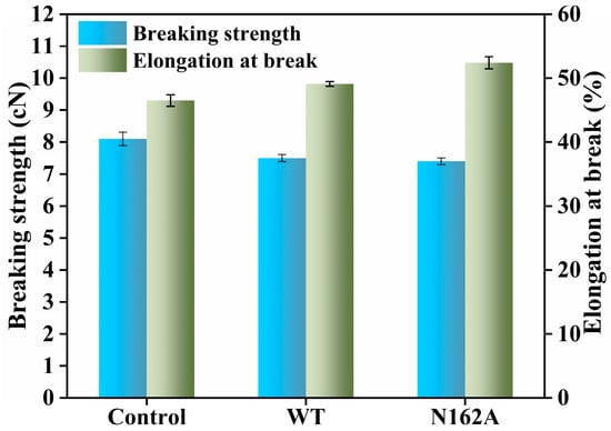 To intuitively observe the degradation of wool by WT and mutant N162A, the residual hydrolysates from various wool treatments were harvested and analyzed for their composition. During the enzymatic treatment, the scale layer of the wool released amino acids or oligopeptides into the system, which could be detected to confirm the treatment’s effectiveness (Figure 5b). In the sample treated in the absence of enzyme, the hydrolysate showed low amino acid content, as the wool scale layer was not degraded. In contrast, the amino acid concentration significantly increased after treatment with WT or N162A, with values of 2.05 mg/mL and 3.30 mg/mL, respectively. The higher amino acid content following N162A treatment indicated its greater hydrolysis efficiency. Figure 5c presents the FTIR spectra of enzyme-treated and untreated wool samples over the range of 4000–700 cm⁻1, excluding the untreated fabric. The characteristic peaks of wool were observed at 1629, 1514, and 1228 cm−1, corresponding to Amide I, Amide II, and Amide III, respectively. Amide I was associated with the stretching vibration of the carbonyl group (C=ONH–R), Amide II was linked to N–H bending deformation, and Amide III was associated with N–H in-plane bending and C–N stretching [32]. The S–O–S derivatives of wool suggest a peak around 1044 cm−1 [33]. The intensity of the peak at 1044 cm−1 weakened following enzyme treatment, suggesting modifications to the disulfide bonds, particularly the partial breakage of the sulfur bonds and their conversion into salt derivatives. Additionally, the intensity of the Amide III peak at 1228 cm−1 changed as a result of the enzymatic treatments. Notably, for N162A treatment, the peak became broader, indicating a reduction in C–N stretching. The characteristic Amide I peak at 1629 cm−1 remained unchanged after enzyme treatment, confirming that no major chemical modifications occurred in the wool. Similarly, the –CH3 stretching vibrational absorption peaks 2920 and 2850 cm−1, which are related to the keratin backbone structure of the wool, also remained unaffected [34]. This result is consistent with our findings shown in Figure 6, where both WT and N162A effectively degraded the wool scale layer with minimal impact on the wool’s mechanical properties.