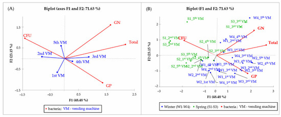 Principal component analysis of microorganism detection and bacterial count (total, Gram-negative (GN), and Gram-positive (GP)) across five vending machines (VM1–VM5) (A) during different seasons (winter: W1–W4 and spring: S1–S3) (B).
