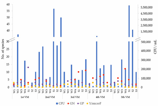 Only two principal components (F1 and F2) describe a high share (71.63%) of the variations in the observed data set. The PCA investigation of the identified number of certain species, total bacterial number, and the CFU per mL in the raw drinking milk samples from different vending machines showed that all observed parameters are distributed in all four quadrants. Thus, according to Figure 1A, the lowest frequency of detection of Gram-negative bacteria was for the raw milk samples from the first vending machine, which are positioned in the third quadrant, the opposite quadrant to the one in which the variable GN (number of Gram-negative bacteria) was positioned. Figure 1B shows that season is also a key parameter because the majority of the green marks (spring season, S1–S3) clustered together, as did the blue marks (winter season, W1–W4). This qualitative insight prompted us to further analyze the number of species and CFU/mL for each raw drinking milk sample from five vending machines according to the measurement dates (seasonal character) (Figure 2).