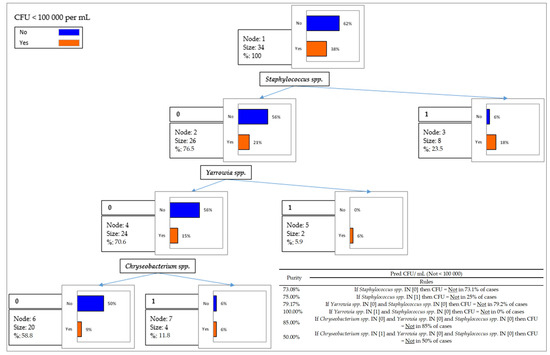 Clustering tree with prediction of expectations of individual strains depending on whether CFU < 100,000 per mL.