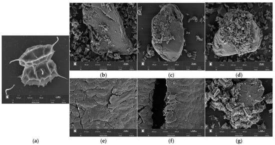 On day 16 of the culture, scanning electron microscopy (SEM) was used to further analyze and observe the surface structures of the microplastic and S. quadricauda composites in each flask. The results revealed that the microalgal cells attached to the surfaces of the microplastics formed distinct clustered structures. The pure culture of S. quadricauda had a four-cell form that was commonly arranged in a single flat linear series, as shown in Figure 1a [36]. In comparison, as shown in Figure 1b–d, the amounts of microalgae attached to the surfaces of the MPs were in the order of PE < PS < PP, indicating that PP held the highest capability for adsorbing S. quadricauda materials. In addition, based on the partial magnification of each MP in Figure 1e–g, the surface of PP was much rougher than those of PE and PS, which could be one of the reasons for the greater aggregation of microalgal cells on it. It should be noted that much substance overlapped between the MPs and algal cells in some micrographs, which was found to be highly related to extracellular polymeric substances (EPSs), which also help in microbial aggregation. The structures of the microplastics provided substantial space for microalgal cell aggregation, which could potentially cause physical damage to the cells. MPs with obvious surface roughness had higher specific surface areas for adsorbing the microalgae.