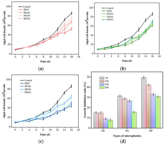 Effects of the microplastic types and sizes on the cell density of S. quadricauda. (a) Changes in cell density in PE wastewater containing different particle sizes; (b) changes in cell density in PS wastewater containing different particle sizes; (c) changes in cell density in PP wastewater containing different particle sizes. (d) Changes in growth inhibition ratio in S. quadricauda with different sizes of PE, PS, and PP (data are shown as the mean +/− SD).