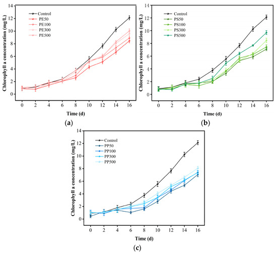 In this study, the growth performance of microalgae was evaluated according to the cell density, day weight, and chlorophyll a (Chl-a) content. It should be noted that more microalgae can produce larger amounts of chlorophyll a [40]. As shown in Figure 2, the cell density of S. quadricauda in the control group reached 8.77 × 106 cells/mL on day 16. Here, PVC held the strongest inhibitory effect on PE and PS. Bergami et al. (2020) [41] also reported that the inhibitory effect of PVC on microalgae (Dunaliella tertiolecta) was 3.9% higher than that of PP, which can be attributed to the differences in their composition and synthesis process.