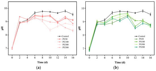 In this study, the growth performance of microalgae was evaluated according to the pH, Fv/Fm, and functional group. As shown in Figure 4, S. quadricauda can grow in a wide range of pH values. In the first two-day operation, the pH value exhibited a strict rise, followed by a subsequent plateau. The microplastic-impacted microalgae demonstrated lower pH levels than the control, peaking at 9.8 on day 10 prior to a gradual decline. Algal metabolism has an influence on the bicarbonate–carbonate equilibrium, leading to a decrease in pH by consuming inorganic carbonate [45]. Feisal et al. (2024) [46] also proved that the degradation of some polymers may yield alkaline byproducts and cause the pH to rise. Similar results were obtained for the inhibition of the photosynthetic process and its lag behind respiration, which contributed to the elevation in pH [47].