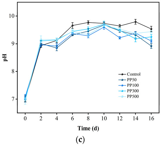 Effects of the microplastic types and sizes on the pH of S. quadricauda. (a) Changes in pH in PE wastewater containing different particle sizes; (b) Changes in pH in PS wastewater containing different particle sizes; (c) Changes in pH in PP wastewater containing different particle sizes.
