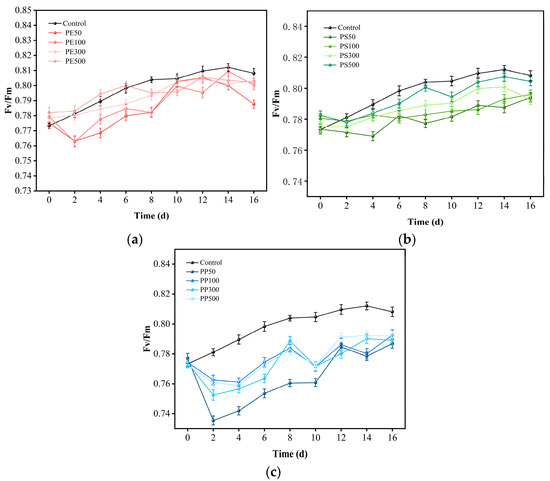 Effects of the microplastic types and sizes on the change in Fv/Fm of S. quadricauda. (a) Changes in the Fv/Fm value in PE wastewater containing different particle sizes of microplastics; (b) Changes in the Fv/Fm value in PS wastewater containing different particle sizes of microplastics; (c) Changes in the Fv/Fm value in PP wastewater containing different particle sizes of microplastics.
