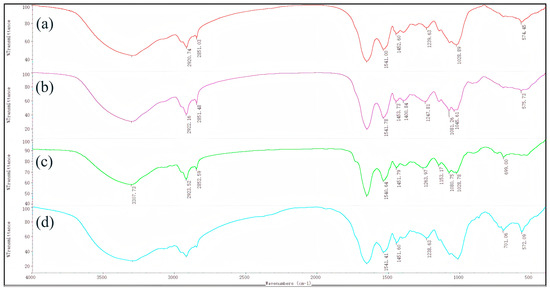 FTIR analysis: (a) S. quadricauda alone; (b) S. quadricauda treated with PE; (c) S. quadricauda treated with PS; (d) S. quadricauda treated with PP.