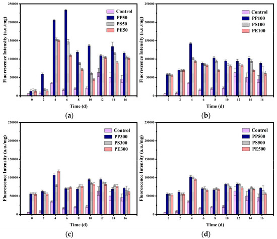 Effects of the microplastic types and sizes on the fluorescence intensity of S. quadricauda. (a) Changes in fluorescence intensity in 50 µm PP, PS, and PE wastewater; (b) changes in fluorescence intensity in 100 µm PP, PS, and PE wastewater; (c) changes in fluorescence intensity in 300 µm PP, PS, and PE wastewater; (d) changes in fluorescence intensity in 500 µm PP, PS, and PE wastewater (the content of neutral lipids in cells is shown by the fluorescence intensity; data are shown as the mean +/− SD).