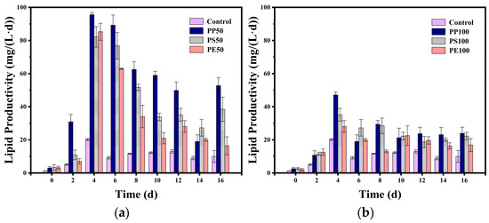 As shown in Figure 8, the PP50 sample group exhibited the highest lipid content on days 4 and 6 with 98.25 mg/(L·d) and 90.12 mg/(L·d), respectively. At the end of the experiment, the 50 µm microplastics also contributed to the highest total lipid content, i.e., 65.4%, which was 3.35, 4.48, 4.29, and 4.94 times higher than the values for 100, 300, 500 µm, and the control. This variation was due to the physical damage from membrane disruption and thylakoid distortion caused by the microplastics, as well as insufficient nitrogen [56]. The results proved that the larger microplastic particles resulted in lower lipid production and accumulation, and more severe damage caused by microplastics would lead to higher nutrient limitation and prompt more lipid accumulation. Additionally, the damage to cell membranes by microplastics may stimulate increased lipid synthesis in microalgal cells to repair compromised membrane structures.