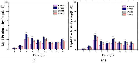 Effects of the microplastic types and sizes on the total lipid content of S. quadricauda. (a) Changes in total lipid content in 50 µm PP, PS, and PE wastewater; (b) changes in total lipid content in 100 µm PP, PS, and PE wastewater; (c) changes in total lipid content in 300 µm PP, PS, and PE wastewater; (d) changes in total lipid content in 500 µm PP, PS, and PE wastewater (data are shown as the mean +/− SD).