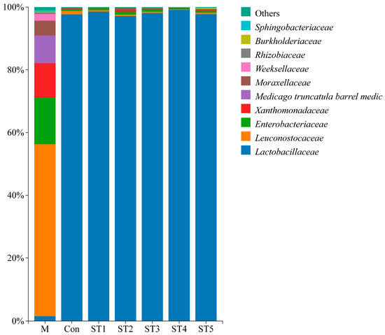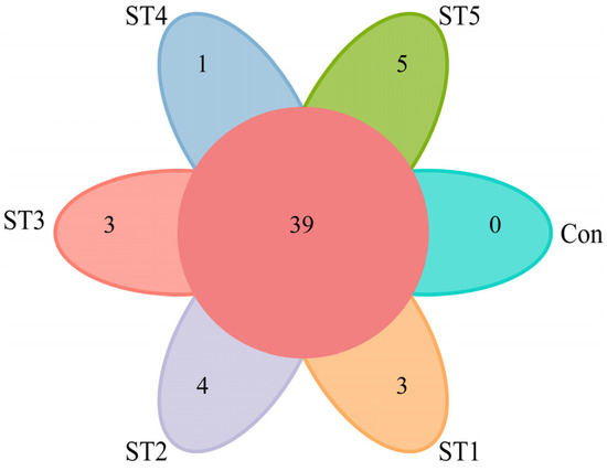 Table 6 displays the alpha diversity of bacteria found in the alfalfa mixed silage. The sequencing data, according to Good’s coverage values, sufficiently represented the majority of bacterial communities. The values of Chao1, Simpson index, and Shannon index for the fresh materials were significantly greater (p < 0.05) than those determined after a period of 30 days, indicating that the multiplicity and richness of bacteria decreased during ensiling, especially in all ST samples. Based on Venn analysis (Figure 1), 39 bacterial OTUs were shared by the honeysuckle extract addition treatment groups and the Control. Furthermore, after 30 days of ensiling, ST1, ST2, ST3, ST4 and ST5 had 3, 4, 3, 1 and 5 specific OTUs, respectively, whereas no specific OTUs were detected in the Control. According to Polley et al. [46], the multiplicity of a microbial community decreases when there is a high abundance of the dominant bacteria. This phenomenon could be attributed to antibacterial actions that modify the competition among bacteria, thus facilitating the growth of beneficial bacterial species in the current study.
