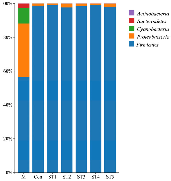 The bacterial relative abundances (at the phylum, genus and species levels) after 30 days can be seen in Figure 2, Figure 3 and Figure 4. In all treatment groups, the most abundant phyla were Firmicutes and Proteobacteria (Figure 2), aligning with earlier studies [47,48,49].