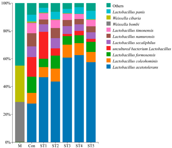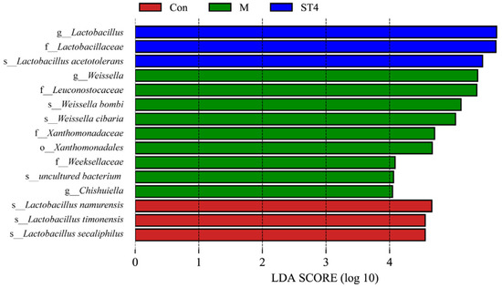 Weissella are heterofermentative LAB that cannot grow at pH < 4.5 [53]. The abundance of Lactobacillus acetotolerans, Lactobacillus coleohominis and Lactobacillus formosensis increased, whereas that of Weissella bombi and Weissella cibaria decreased after 30 days. In particular, the abundance of L. acetotolerans showed an upward trend as the content of Lonicerae flos extract increased (Figure 4). Similarly, according to Li et al. [54], residues of mint and purple perilla could play a role in enhance the enrichment of L. acetotolerans during the ensiling process.
