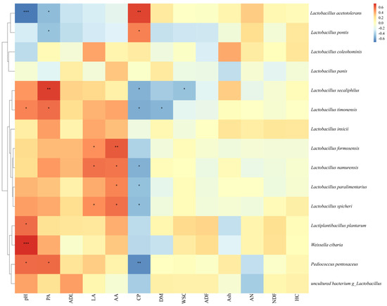 Heatmap showing the relationship between key bacterial species (15 most abundant species) and silage parameters. *, p < 0.05; **, p < 0.01; ***, p < 0.001.