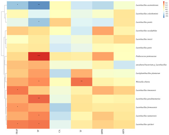 The heatmap, which is based on Spearman’s correlation at the species level (Figure 7), illustrates the connections between the microbial community and fermentation characteristics (such as pH, AN, LA, AA, DM, WSC, NDF, ADL, HC and Ash). The fermentation of silage is a complex biological process, in which Lactobacillus plays a crucial role. This genus positively impacts lactic acid synthesis, while also influencing the pH and NH3-N levels [25,38]. Consistent with previous studies, alterations in the community of lactic acid bacteria could significantly impact of the quality of silage fermentation. A negative correlation (p < 0.05) was observed between L. acetotolerans and the pH level, whereas a positive correlation (p < 0.05) was noted between pH and the presence of Pediococcus pentosaceus, Weissella cibaria, Lactiplantibacillus plantarum and L. timonensis, suggesting that the observed decrease in pH was largely due to Lactobacillus activity. During the initial phases of ensiling, Lactococci initiate the lactic acid fermentation process [54]; however, their survival rate declines in acidic environments. Therefore, lactic acid-producing rods, such as Lactobacillus, are of primary importance for the decline in pH in the later phases of ensiling. The were positive correlations (p < 0.05) between LA content and Lactobacillus formosensis, L. namurensis and L. spicheri and positive correlations (p < 0.05) between AA content and Lactobacillus paralimentarius, Lactobacillus formosensis, L. namurensis and L. spicheri. In addition, there existed an effective negative correlation (p < 0.05) between CP and L. namurensis, L. paralimentarius, L. spicheri, L. secaliphilus, L. timonensis and Pediococcus pentosaceus and a significant positive correlation (p < 0.05) between CP and L. acetotolerans and L. pontis. In addition, there was a negative correlation between DM and L. timonensis, and a negative correlation between WSC and L. secaliphilus, implying that microbes, especially Lactobacillus, significantly affected the nutritional quality of fermentation.