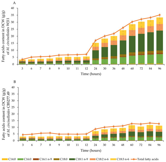 Comparative profiles of the fatty acid composition of M. circinelloides strains, (A) WJ11, and (B) CBS277.49. The values are means with standard deviations.