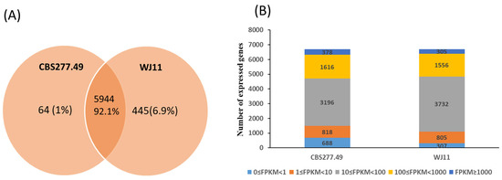 Comparative gene expression of transcriptomes of M. circinelloides CBS277.49 and M. circinelloides WJ11 cultures. (A) Venn diagram showing the expressed genes unique and common to each strain of M. circinelloides. (B) Quantification of gene expression levels in each strain based on different FPKM thresholds.