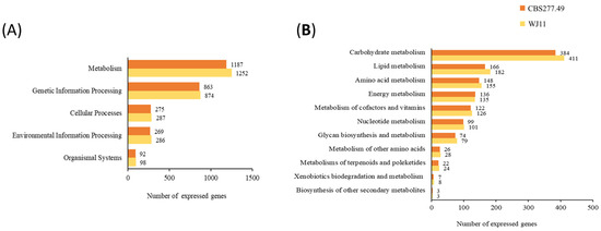 The result of functional annotation across several protein databases upon KEGG classification is provided. Accordingly, the functions of expressed genes were classified into five major categories as seen in Figure 3A and Supplementary File S7, including metabolism (1252 genes in WJ11 and 1187 genes in CBS277.49), genetic information processing (874 genes in WJ11 and 863 genes in CBS277.49), environmental information processing (286 genes in WJ11 and 269 genes in CBS277.49), cellular processes (287 genes in WJ11 and 275 genes in CBS277.49), and organismal systems (98 genes in WJ11 and 92 genes in CBS277.49). Within the top list of metabolic sub-categories (Figure 3B and Supplementary File S8), the WJ11 culture consistently expressed the genes involved in lipid metabolism (182 genes), amino acid metabolism (155 genes), and carbohydrate metabolism (411 genes) with a higher number over another strain. These findings are in line with the enhanced capacity for lipid production of the WJ11 strain, as lipid biosynthesis involves lipid, amino acid, and carbohydrate metabolisms [20].