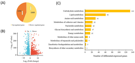 The total number of orthologous protein-encoding genes (6708 genes) was compared to the expressed genes of WJ11 (6389 genes) and CBS277.49 (6008 genes) (Table 2). A comparative DEG analysis was then conducted for the two strains, WJ11 and CBS277.49. As a result, 2811 significant genes with 1569 upregulated and 1242 downregulated genes were identified under thresholds |log2FC| ≥ 1 and q-value < 0.05, as illustrated in Figure 4A and Supplementary File S9. An expression volcano plot of both upregulated and downregulated DEGs is illustrated in Figure 4B. The significant genes were classified based on KEGG to explore the critical attributes in the transcriptional regulation of WJ11 and CBS277.49 strains (Figure 4C and Supplementary File S10). Interestingly, the top three lists of significantly upregulated genes were found in carbohydrate metabolism (133 genes), lipid metabolism (61 genes), and amino acid metabolism (31 genes).