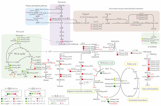 A comparison of key significant genes and their enzymes involved in central carbon metabolism towards amino acid and lipid metabolism identified in M. circinelloides strain WJ11 compared with the strain CBS277.49.