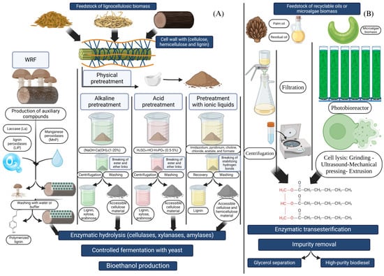 Pretreatments for bioethanol and biodiesel: From biomass to energy. (A) Pretreatments used in lignocellulosic biomass for bioethanol production. (B) Pretreatments in oils, fats, and microalgae biomass for biodiesel production.