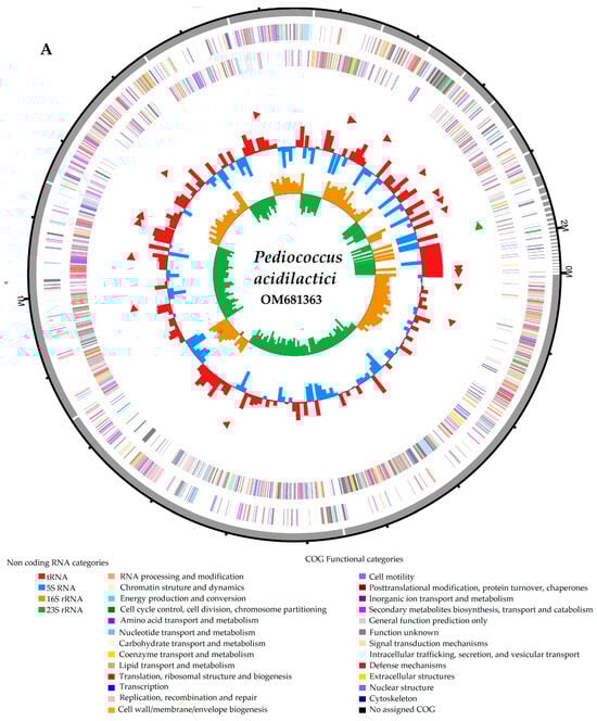 Chromosome maps of the assembled sequences, drawn using CGView software. (A) P. acidilactici OM681363, (B) L. paracasei ON606241.