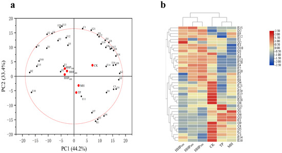 In addition, a hierarchical cluster analysis (HCA) (Figure 1b) based on the Euclidean distance was performed on the primary aromatic components, utilizing different color tags to represent various aromatic compound contents. The results are shown in Figure 1. The mulberry vinegar samples were divided into two clusters: one cluster contained the three HHP groups, while the other cluster included the remaining samples. This indicates that, compared to the MH and TP groups, the three HHP groups exhibited higher ester content. In summary, the HHP and CK groups demonstrated a greater abundance and concentration of ester compounds compared to other treatments.