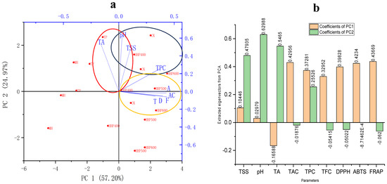 A comprehensive multivariate analysis (Figure 2a) was conducted on the physicochemical parameters, phytochemical contents, and antioxidant properties of mulberry fruit vinegar subjected to different sterilization methods, utilizing eigenvectors derived from principal component analysis (PCA). This analysis focused on key parameters such as total soluble solids (TSS), pH, total acidity (TA), total antioxidant capacity (TAC), total phenolic content (TPC), total flavonoid content (TFC), and antioxidant assays, including DPPH, ABTS, and FRAP.