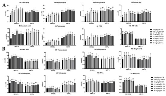 Effects of oxalic acid (OA) supplementation (0, 2.5, 5, 10, 20, 40, and 80 mg/kg DM) in low (HM10.3%) and high (HM17%) hemicellulose diets on acetic acid, propionic acid, butyric acid, isobutyric acid, isovaleric acid, valeric acid, total volatile fatty acids and the ratio of acetic acid to propionic acid production (mmol/L) in vitro for 6 h (A) and 12 h (B). Different superscripts in figure imply that their mean values are significantly different (p < 0.05).