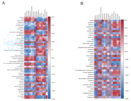 The correlation between rumen metabolites and bacterial genus composition (A): The correlation analysis results between rumen metabolites and bacterial genus composition were demonstrated when 10 mg/kg DM oxalic acid was added to a diet with low hemicellulose level. It is presented in the form of a heat map. The depth of color in the figure indicates the strength of the correlation; red indicates a positive correlation, blue indicates a negative correlation, and the darker the color, the stronger the correlation. (B): The correlation analysis between rumen metabolites and bacterial genera was presented when 10 mg/kg DM oxalic acid was added at a high hemicellulose level. The specific expression method and analytical significance were the same as in (A). ** Indicates that p < 0.001, and * indicates when 0.05 ≥ p ≥ 0.001.