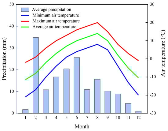 The experimental site was located in the corral of Haiyan County, Haibei Tibetan Autonomous Prefecture, Qinghai Province (36.93° N, 100.86° E, altitude 3132.0 m), which has a plateau sub-arid climate with a dry and windy spring, a cool summer, a shortfall, and a long winter. The average annual temperature is 1.5 °C, the annual sunshine hours are about 2980 h, there is no absolute frost-free period, and there are frequent natural disasters such as hail, frost, drought, and sandstorms. The temperature and precipitation of the experimental site in 2023 are shown in Figure 1.
