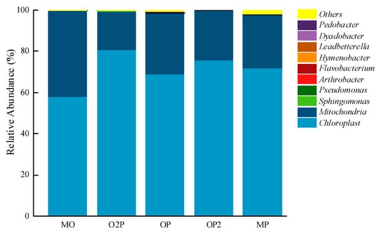 The raw materials prior to ensiling were subjected to withering at 105 °C for 1 h. Subsequently, after being dried at 70 °C, their nutritional quality was measured, and the results are presented in Table 2. Figure 2 shows the composition of microbial communities in silage raw materials. The proportions of the final biomass of oats and peas before ensiling under each treatment were as follows: in O2P, oats accounted for 78.4% and peas accounted for 21.6%; in OP, oats accounted for 60.7% and peas accounted for 39.3%; in OP2, oats accounted for 55.2% and peas accounted for 43.8%.