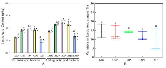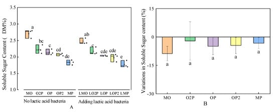 From Figure 3A, overall, MO had the highest soluble sugar content and LMP had the lowest soluble sugar content. In the group with added LAB, the SS content of O2P, OP, and OP2 was significantly increased by 21.9%, 16.9%, and 13.7% compared to MP. In the group without added LAB, the SS content of LO2P, LOP, and LOP2 was significantly higher than that of LMP (p < 0.05). From Figure 3B, the variation in the SS content in the group with added LAB compared with the group without added LAB was less than 0, i.e., the SS content of the groups was reduced by the added LAB treatment, and there was no significant difference in the variation in the SS content of different mixed cropping ratios.
