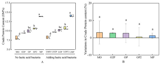 From Figure 4A, in the group without added LAB, MO had the lowest CP content and MP had the highest CP content, and the CP content gradually increased with the increase in pea mixed cropping proportion. O2P, OP, and OP2 had significant increases of 16.5%, 23.5%, and 31.6% (p < 0.05), respectively, compared to MO. In the group with added LAB, LMO had the lowest CP content and LMP had the highest CP content. From Figure 3B, the variation in CP content in the LAB-added group compared with the group without LAB was less than 0, i.e., the CP content of the groups increased after the addition of LAB, and there was no significant difference in the variation in CP content between the groups with different mixed cropping ratios.