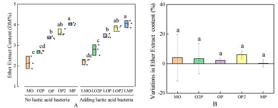 From Figure 5A, in the group without added LAB, the lowest EE content was found in MO and the highest in MP. The EE content in the O2P, OP, and OP2 groups was significantly higher than that in the MO group (p < 0.05). In the LAB addition group, the highest EE content was found in LMP and the lowest in LMO. From Figure 4B, the variation in EE content was greater than 0. The EE content of all LAB-added groups was slightly higher than that of the groups without LAB, and there was no significant difference among the mixed cropping treatment groups.